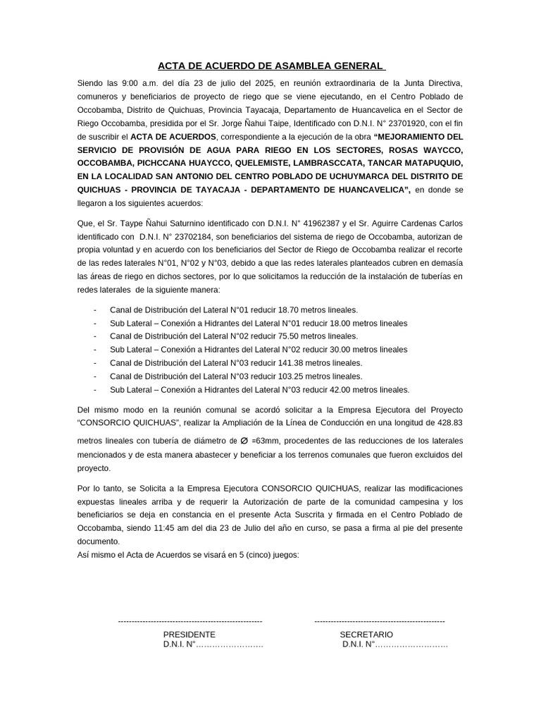 Riego Occobamba, presidida por el Sr. Jorge Ñahui Taipe, Identificado con D.N.I. N° 23701920, con el fin