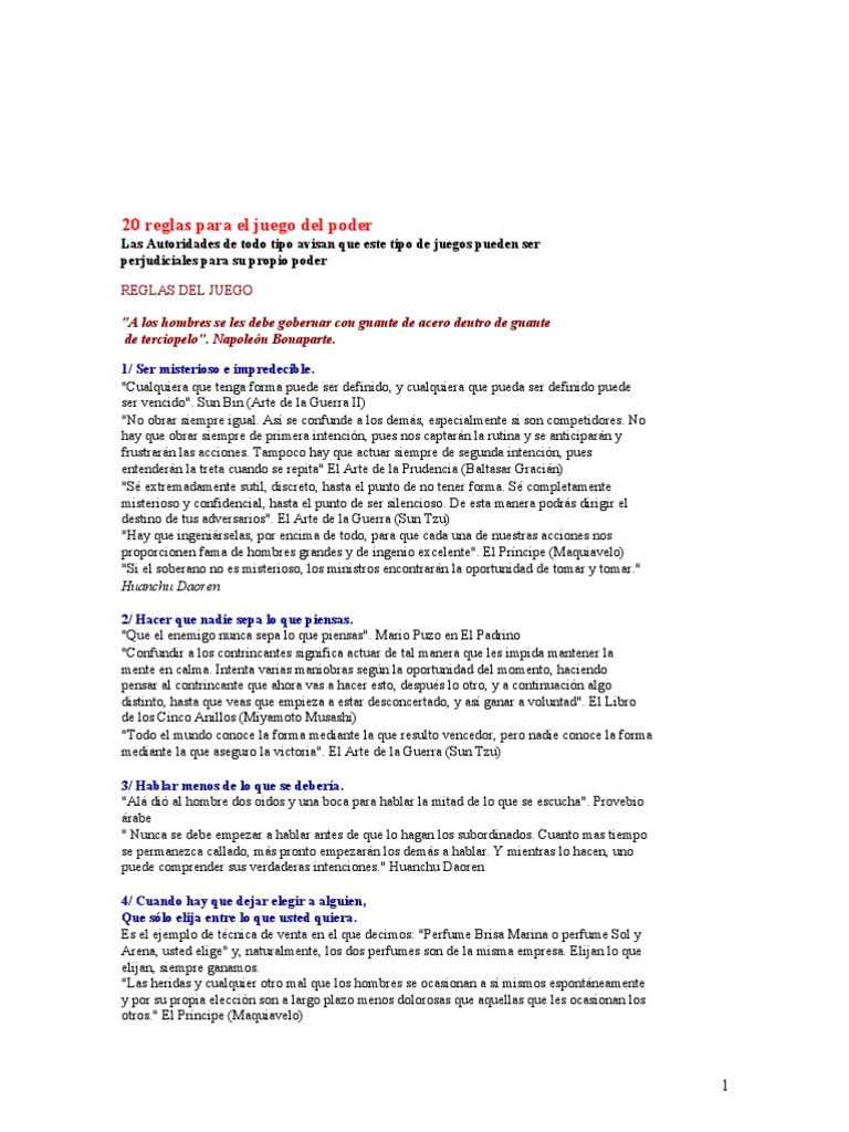 Las Autoridades de todo tipo avisan que este tipo de juegos pueden ser perjudiciales para su propio poder REGLAS DEL JUEGO "A los hombres se les debe gobernar con guante de acero dentro de guante de terciopelo". Napolen Bonaparte. 1/ Ser misterioso e impredecible. "Cualquiera que tenga forma puede ser definido, y cualquiera que pueda ser definido puede ser vencido". Sun Bin (Arte de la Guerra II) "No obrar siempre igual. As se confunde a los dems, especialmente si son competidores. No hay que obrar siempre de primera intencin, pues nos captarn la rutina y se anticiparn y frustrarn las acciones. Tampoco hay que actuar siempre de segunda intencin, pues entendern la treta cuando se repita" El Arte de la Prudencia (Baltasar Gracin) "S extremadamente sutil, discreto, hasta el punto de no tener forma. S completamente misterioso y confidencial, hasta el punto de ser silencioso. De esta manera podrs dirigir el destino de tus adversarios". El Arte de la Guerra (Sun Tzu) "Hay que ingenirselas, por encima de todo, para que cada una de nuestras acciones nos proporcionen fama de hombres grandes y de ingenio excelente". El Prncipe (Maquiavelo) "Si el soberano no es misterioso, los ministros encontrarn la oportunidad de tomar y tomar." Huanchu Daoren 2/ Hacer que nadie sepa lo que piensas. "Que el enemigo nunca sepa lo que piensas". Mario Puzo en El Padrino "Confundir a los contrincantes significa actuar de tal manera que les impida mantener la mente en calma. Intenta varias maniobras segn la oportunidad del momento, haciendo pensar al contrincante que ahora vas a hacer esto, despus lo otro, y a continuacin algo distinto, hasta que veas que empieza a estar desconcertado, y as ganar a voluntad". El Libro de los Cinco Anillos (Miyamoto Musashi) "Todo el mundo conoce la forma mediante la que resulto vencedor, pero nadie conoce la forma mediante la que aseguro la victoria". El Arte de la Guerra (Sun Tzu) 3/ Hablar menos de lo que se debera. "Al di al hombre dos oidos y una boca para hablar la mitad de lo que se escucha". Provebio rabe " Nunca se debe empezar a hablar antes de que lo hagan los subordinados. Cuanto mas tiempo se permanezca callado, ms pronto empezarn los dems a hablar. Y mientras lo hacen, uno puede comprender sus verdaderas intenciones." Huanchu Daoren 4/ Cuando hay que dejar elegir a alguien, Que slo elija entre lo que usted quiera. Es el ejemplo de tcnica de venta en el que decimos: "Perfume Brisa Marina o perfume Sol y Arena, usted elige" y, naturalmente, los dos perfumes son de la misma empresa. Elijan lo que elijan, siempre ganamos. "Las heridas y cualquier otro mal que los hombres se ocasionan a s mismos espontneamente y por su propia eleccin son a largo plazo menos dolorosas que aquellas que les ocasionan los otros." El Prncipe (Maquiavelo)