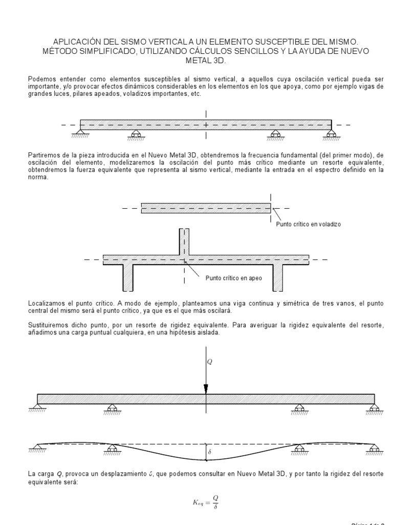 Partiremos de la pieza introducida en el Nuevo Metal 3D, obtendremos la frecuencia fundamental (del primer modo), de oscilacin del elemento, modelizaremos la oscilacin del punto ms crtico mediante un resorte equivalente, obtendremos la fuerza equivalente que representa al sismo vertical, mediante la entrada en el espectro definido en la norma.