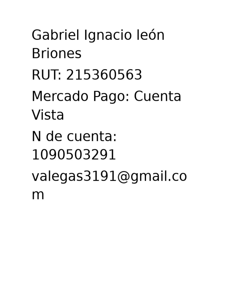 BrionesRUT: 215360563Mercado Pago: CuentaVistaN de cuenta:1090503291valegas3191@gmail.com