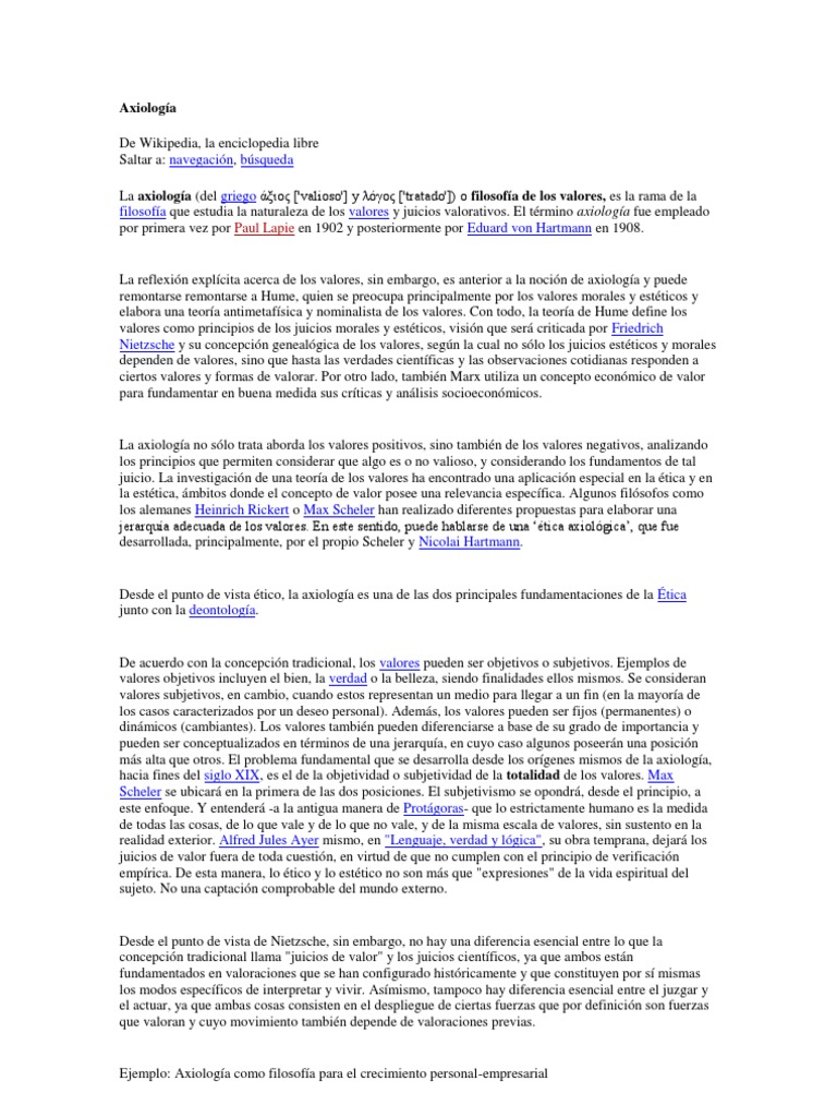 s, es la rama de la filosofa que estudia la naturaleza de los valores y juicios valorativos. El trmino axiologa fue empleado por primera vez por Paul Lapie en 1902 y posteriormente por Eduard von Hartmann en 1908.