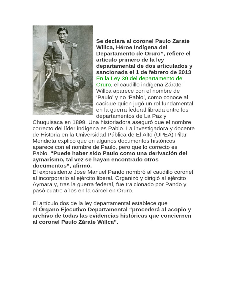 Aymara y, tras la guerra federal, fue traicionado por Pando y
