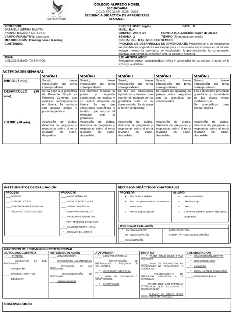 METODOLOGÍA: Thinking based learning FECHA: DEL 8 AL 12 DE SEPTIEMBRE