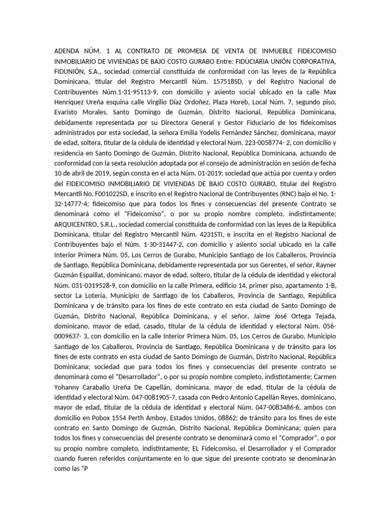 1 AL CONTRATO DE PROMESA DE VENTA DE INMUEBLE FIDEICOMISO