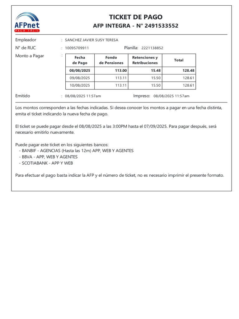 Para efectuar el pago basta indicar la AFP y el número de ticket, no es necesario imprimir el presente formato.