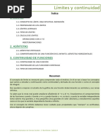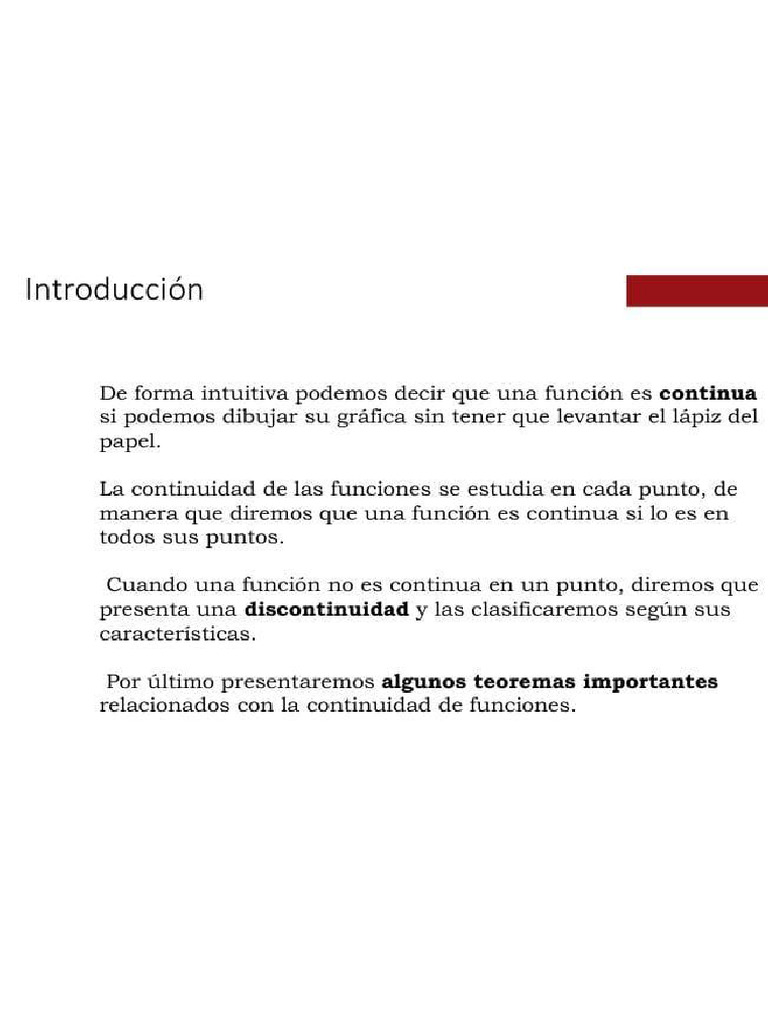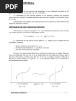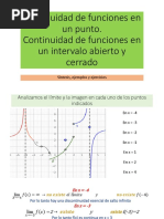 El documento aborda la continuidad de funciones, definiendo que una función es continua en un punto si se cumplen ciertas condiciones y clasificando las discontinuidades en evitables, de salto finito e infinito. Se presentan ejemplos y propiedades de funciones continuas, así como teoremas importantes como el de Bolzano y el del valor intermedio, que garantizan la existencia de raíces y valores intermedios en funciones continuas. Se enfatiza la importancia de calcular el dominio de una función antes de estudiar su continuidad.