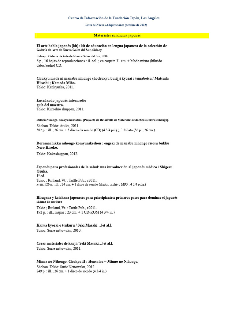 Lista de Nuevas Adquisiciones (octubre de 2012)