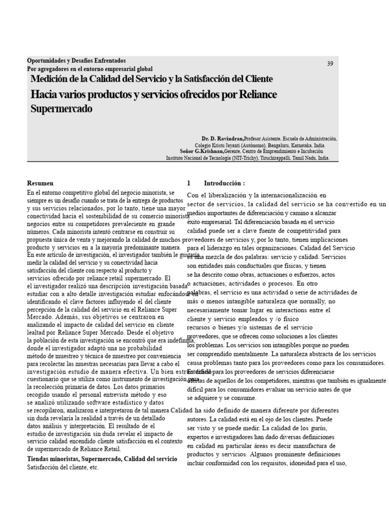percepción de la calidad del servicio en el Reliance Super necesariamente tomar lugar en interactions entre el