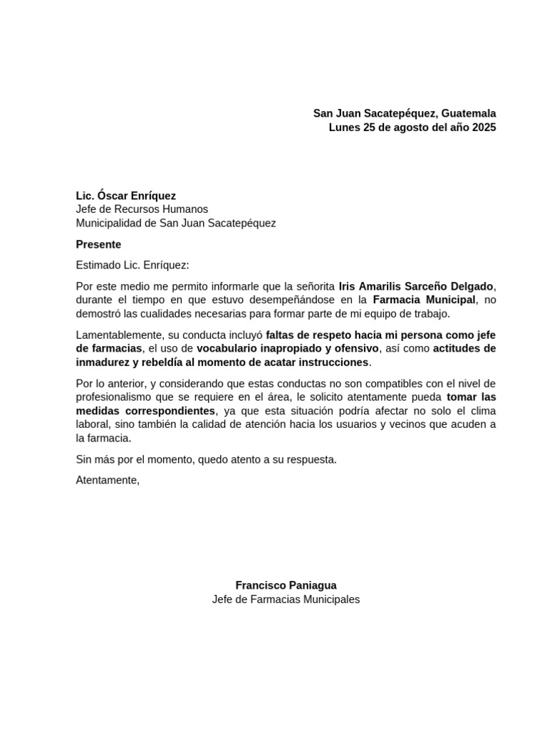 Lamentablemente, su conducta incluyó faltas de respeto hacia mi persona como jefe