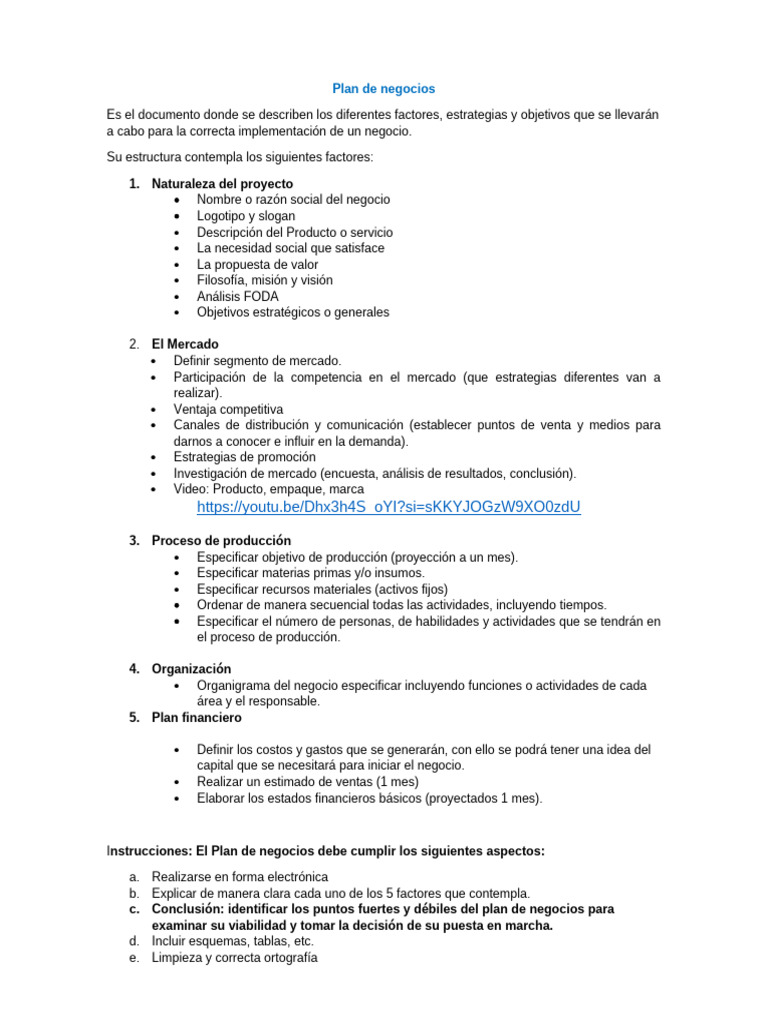 Instrucciones: El Plan de negocios debe cumplir los siguientes aspectos:
