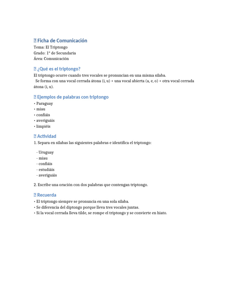 1. Separa en sílabas las siguientes palabras e identifica el triptongo: