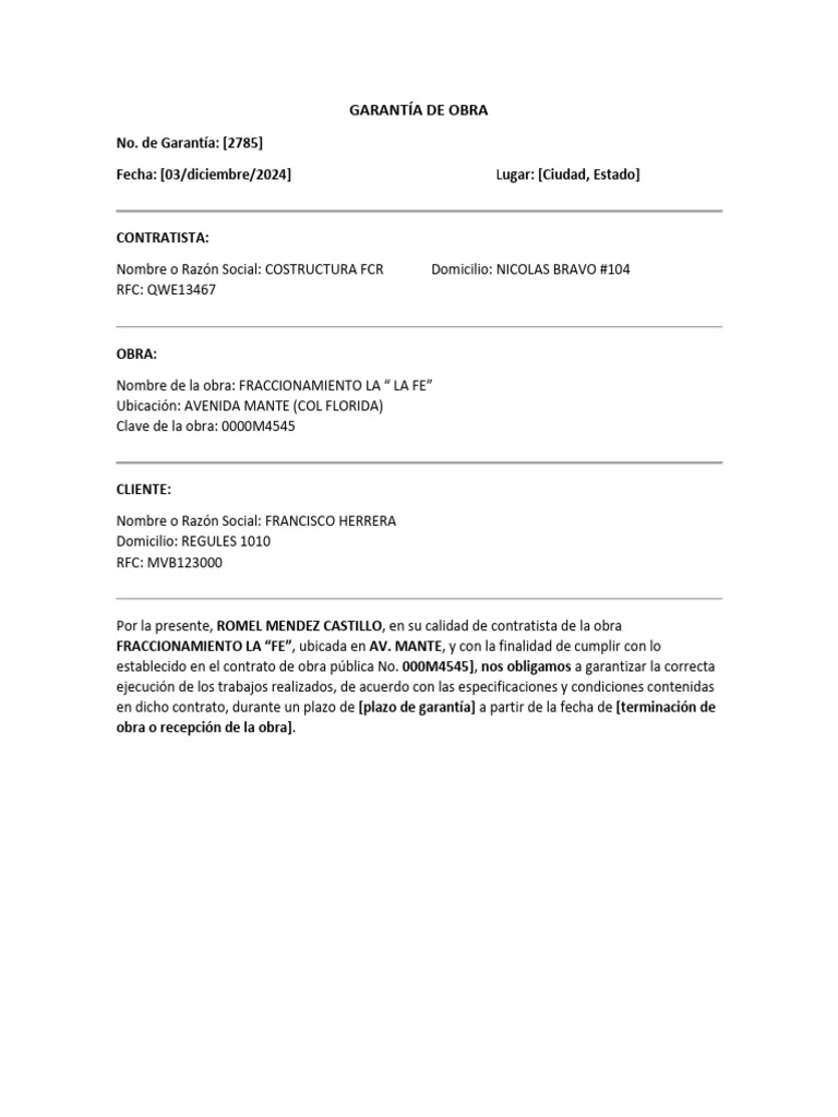 establecido en el contrato de obra pública No. 000M4545], nos obligamos a garantizar la correcta