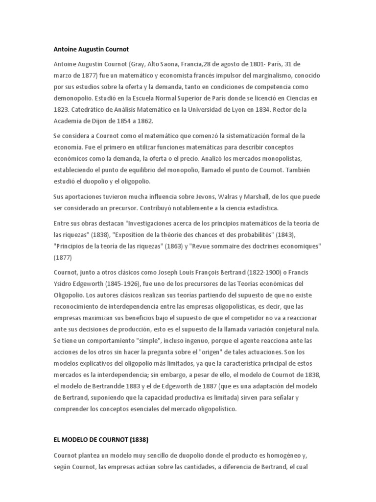 fue un matemtico y economista francs impulsor del marginalismo, conocido por sus estudios sobre la oferta y la demanda, tanto en condiciones de competencia como demonopolio. Estudi en la Escuela Normal Superior de Pars donde se licenci en Ciencias en 1823. Catedrtico de Anlisis Matemtico en la Universidad de Lyon en 1834. Rector de la Academia de Dijon de 1854 a 1862. Se considera a Cournot como el matemtico que comenz la sistematizacin formal de la economa. Fue el primero en utilizar funciones matemticas para describir conceptos econmicos como la demanda, la oferta o el precio. Analiz los mercados monopolistas, estableciendo el punto de equilibrio del monopolio, llamado el punto de Cournot. Tambin estudi el duopolio y el oligopolio. Sus aportaciones tuvieron mucha influencia sobre Jevons, Walras y Marshall, de los que puede ser considerado un precursor. Contribuy notablemente a la ciencia estadstica. Entre sus obras destacan "Investigaciones acerca de los principios matemticos de la teora de las riquezas" (1838), "Exposition de la thorie des chances et des probabilits" (1843), "Principios de la teora de las riquezas" (1863) y "Revue sommaire des doctrines economiques" (1877) Cournot, junto a otros clsicos como Joseph Louis Franois Bertrand (1822-1900) o Francis Ysidro Edgeworth (1845-1926), fue uno de los precursores de las Teoras econmicas del Oligopolio. Los autores clsicos realizan sus teoras partiendo del supuesto de que no existe reconocimiento de interdependencia entre las empresas oligopolsticas, es decir, que las empresas maximizan sus beneficios bajo el supuesto de que el competidor no va a reaccionar ante sus decisiones de produccin, esto es el supuesto de la llamada variacin conjetural nula. Se tiene un comportamiento "simple", incluso ingenuo, porque el agente reacciona ante las acciones de los otros sin hacer la pregunta sobre el "origen" de tales actuaciones. Son los modelos explicativos del oligopolio ms limitados, ya que la caracterstica principal de estos mercados es la interdependencia; sin embargo, a pesar de ello, el modelo de Cournot de 1838, el modelo de Bertrandde 1883 y el de Edgeworth de 1887 (que es una adaptacin del modelo de Bertrand, suponiendo que la capacidad productiva es limitada) sirven para sealar y comprender los conceptos esenciales del mercado oligopolstico.