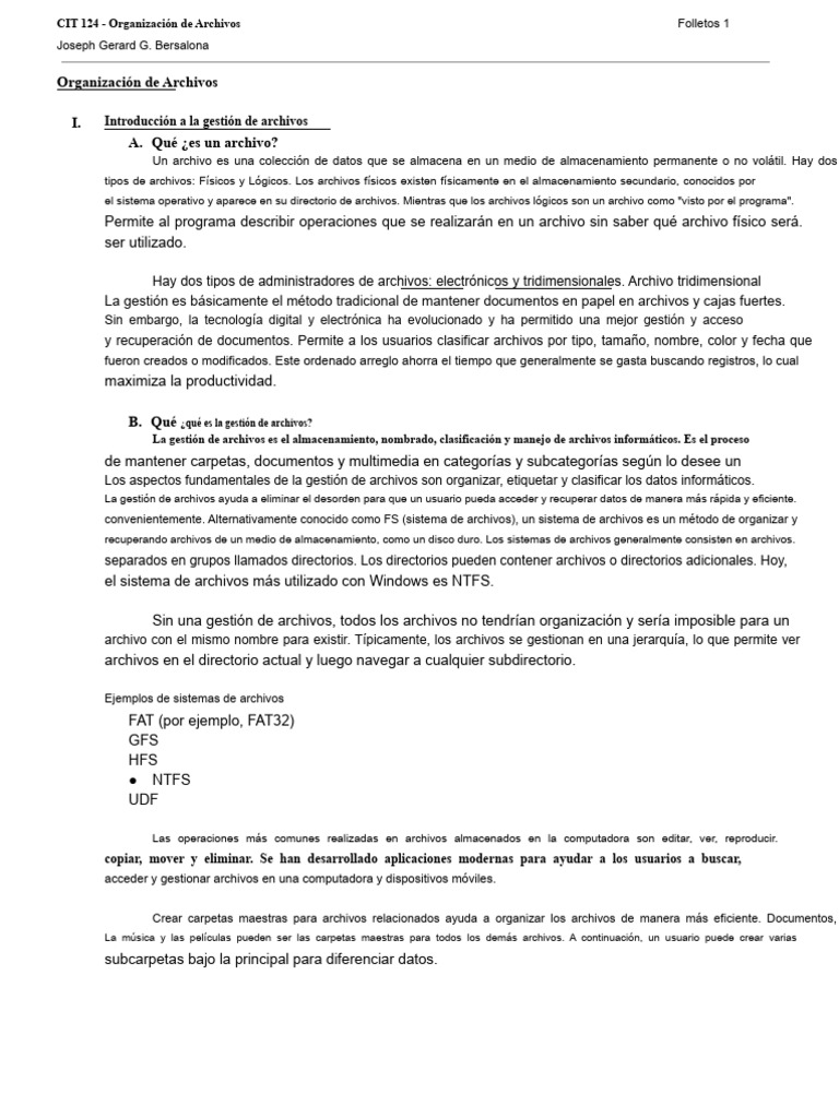 La gestión de archivos es el almacenamiento, nombrado, clasificación y manejo de archivos informáticos. Es el proceso