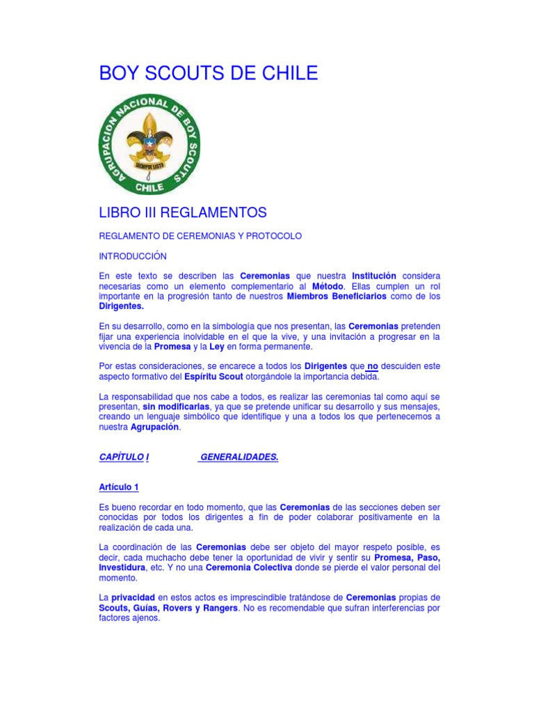 Artculo 1 Es bueno recordar en todo momento, que las Ceremonias de las secciones deben ser conocidas por todos los dirigentes a fin de poder colaborar positivamente en la realizacin de cada una. La coordinacin de las Ceremonias debe ser objeto del mayor respeto posible, es decir, cada muchacho debe tener la oportunidad de vivir y sentir su Promesa, Paso, Investidura, etc. Y no una Ceremonia Colectiva donde se pierde el valor personal del momento. La privacidad en estos actos es imprescindible tratndose de Ceremonias propias de Scouts, Guas, Rovers y Rangers. No es recomendable que sufran interferencias por factores ajenos.