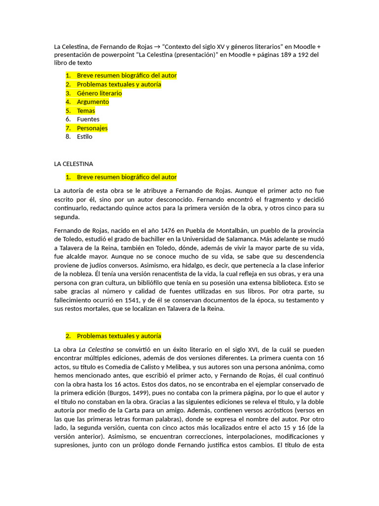 La Celestina, de Fernando de Rojas → “Contexto del siglo XV y géneros literarios” en Moodle +