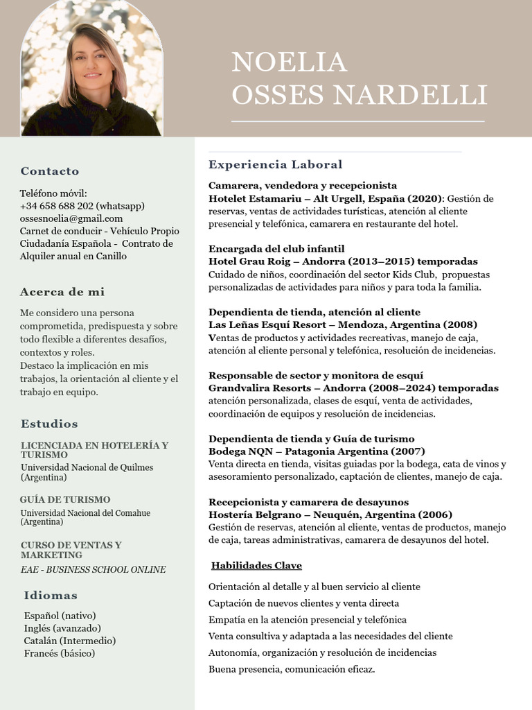 de caja, tareas administrativas, camarera de desayunos del hotel.
