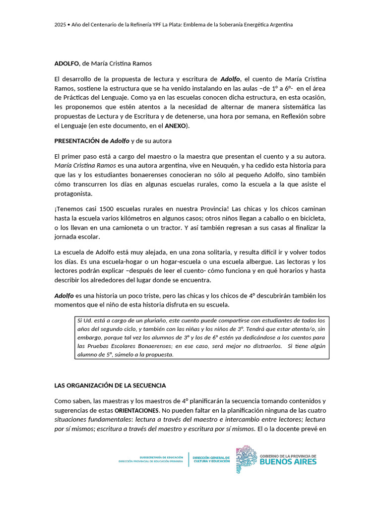 b) “Escuchen qué dice el narrador en las páginas 5 y 6 (relee). El narrador cuenta que Adolfo