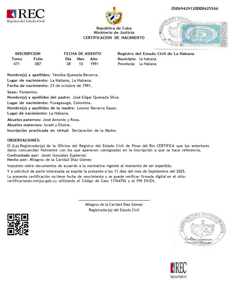 El (La) Registrador(a) de la Oficina del Registro del Estado Civil de Pinar del Rio CERTIFICA que los anteriores
