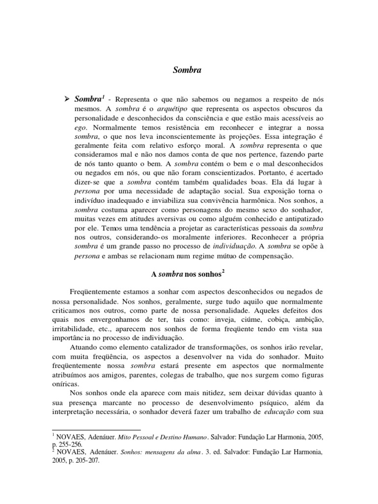 sombra. Este termo foi empregado por Jung, dentre outras conceituaes, como uma das fases do processo de desenvolvimento psicoterpico, necessria para que se estabelea uma adaptao social do indivduo, aps a percepo dos seus contedos sombrios. Os sonhos tambm convidam o sonhador percepo da sombra e, principalmente, necessidade de buscar uma nova forma de educao para a vida social. A sombra, por ser o arqutipo cujas representaes esto mais acessveis conscincia, estar mais presente nos sonhos e ut ilizar os smbolos mais diversos para provocar a necessria transformao do sonhador. s vezes, a sombra surge em atitudes contrrias tendncia do ego desperto, quando este j se afastou daquele comportamento, o que nega o antigo conceito reducionista de que os sonhos sejam apenas a realizao de desejos. Tais sonhos trazem resqucios da culpa pelo passado j redimido, embora no esquecido. Ao contrrio do que se possa pensar, nossa sombra no est somente presente nos chamados maus sonhos ou pesadelos. A sombra pode surgir nos sonhos, cuja serenidade se transfere para o estado de viglia, durante horas ou dias. Ela nem sempre deixa marcas desagradveis no sonho, pois suas caractersticas podem se revestir de aspectos negados ou desconhecidos, portanto tambm positivos. necessrio, em toda anlise, que a identificao da sombra seja levada parcialmente conscincia, sobretudo aquela constituda e alicerada na infncia, a fim de que ocorra o funcionamento adequado do ego. Os sonhos podem trazer a parte da sombra que deve ser conscientizada. A incluso da parte revelada uma necessidade que implicar na avaliao das verdades morais adotadas pelo indivduo at ento. um processo que exigir coragem e prudncia, por se tratar de uma deciso adulta, da qual o terapeuta um aliado importante. Pode-se dizer, sem receio de erro, que seramos extremamente pobres, quais metades inteis de um instrumento, se fssemos apenas o que pensamos que somos. A sombra parte indissocivel da personalidade. Quem pensa que sempre tem razo, luta muito com sua prpria sombra, que inevitavelmente, estar mostrando o contrrio. Em que pese os pesadelos serem tomados geralmente ao nvel do sujeito, isto , de forma subjetiva, e considerados como referentes aos aspectos da sombra do sonhador, prefiro, preliminarmente, procurar uma correlao com aspectos envolvendo sua vida espiritual. Quando possvel, estabeleo inicialmente uma interpretao ao nvel do objeto, porm numa tica interexistencial. Pergunto-me se aquele sonho ou pesadelo no estaria trazendo algo que objetivamente est acontecendo durante o sono. Caso no encontre tal correlao ou, mesmo encontrando, ela me parea inverossmil, tento tambm perceb-la numa srie de sonhos. Se ainda assim no houver camp o para aquela interpretao, passo ento a analis-lo do ponto de vista subjetivo. A interpretao do ponto de vista espiritual no induzida ao paciente, mas conservada por mim, como referencial para uma melhor conduo de seu caso.