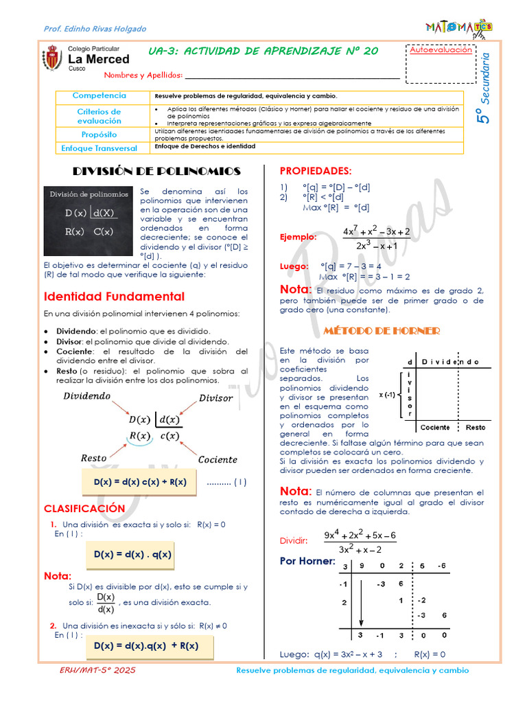 • Aplica los diferentes métodos (Clásico y Horner) para hallar el cociente y residuo de una división