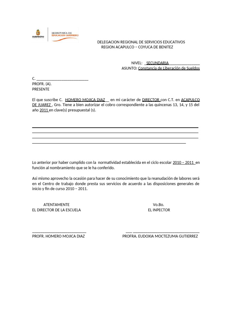 El que suscribe C. HOMERO MOJICA DIAZ__ en mi carácter de DIRECTOR con C.T. en ACAPULCO