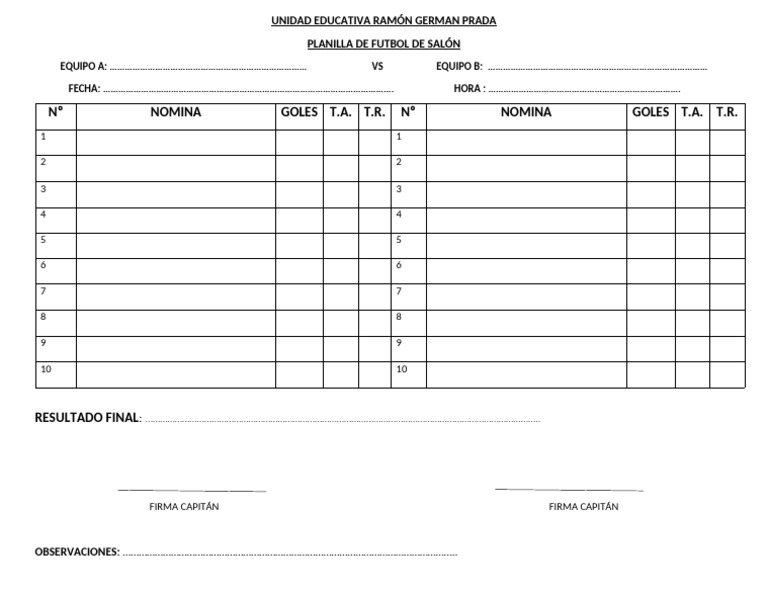 PLANILLA DE FUTBOL DE SALÓN