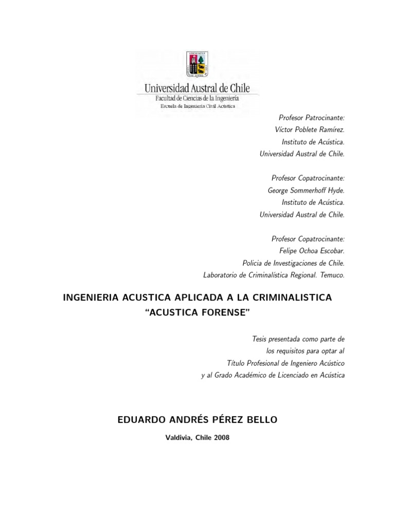 verstil en lo que a sus campos profesionales se reere, siendo la criminal a stica una nueva rea a de especializacin de esta carrera. En la actualidad, la acstica forense es un tanto desconocida o u ya que lleva solamente cinco aos de labor, principalmente desarrollada por la seccin de sonido n o del laboratorio de criminal stica. Es por esto, que la tesis pretende dar a conocer distintas reas a que abarca la especialidad, y as fomentar la inquietud de querer desarrollar trabajos futuros conducentes al mejoramiento de las tcnicas aplicadas en la acstica forense en nuestro pa e u s.