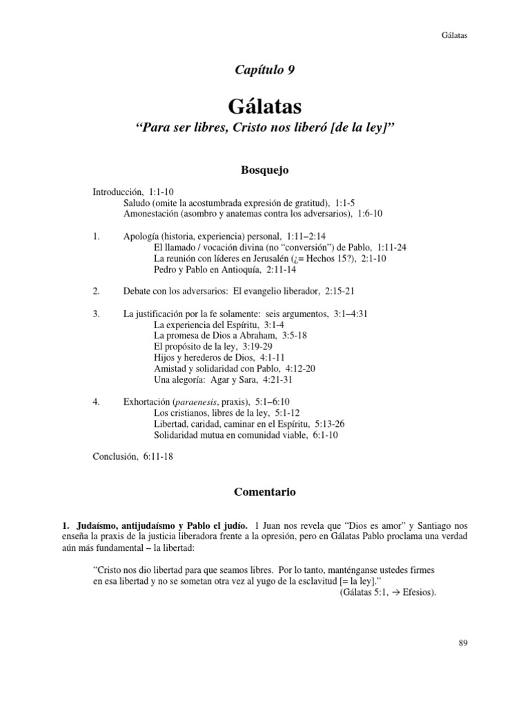 Antioqua; (3) para Pablo la Tor era ms que leyes, pues representaba una gran narracin salvfica que deba determinar las condiciones para la entrada de los Gentiles. Sin embargo, tanto Pablo como sus adversarios procuraron reestructurar el Judasmo para incluir a los Gentiles. Los adversarios insistieron en un sistema legal binario que distingui entre los de adentro y los de afuera. La narracin de Pablo tambin estableci un sistema binario, pero que insisti en la fe de Cristo (Gal 2:20) como el elemento crucial y propuso convertir a los Gentiles en Judos. Para persuadir a los Glatas, Pablo construy un nuevo discurso con tres elementos: (1) un nuevo yo colonial; (2) un nuevo ethnos; (3) una nueva estructura de autoridad. 4.2 La Construccin del Nuevo Yo Colonial. Primero Pablo construy un yo autnomo, un hbrido ambivalente, parecido pero tambin diferente al de las autoridades coloniales de Jerusaln (en la seccin autobiogrfica, Gal 1:11-2:10). Tal autonoma, con nfasis en su vocacin apostlica (1:1, 15-16, no una conversin del judasmo al cristianismo) sirvi como paradigma para los Glatas en su relacin con Jerusaln. La seccin autobiogrfica hace hincapi en la importancia y la autonoma de Pablo y an irnicamente disminuye la importancia de los lderes que tenan cierta reputacin (hoy dokountes, 2:2, 6, 6, 9; cuatro veces). El resumen autobiogrfico de Pablo protest as ante cualquier arreglo colonial con Jerusaln y en su interpretacin alegrica de Sara y Agar como una Jerusaln celestial y libre y otra terrestre y esclava (Gal 4:21-5:1), la autoridad para el ministerio de Pablo vino del cielo. 4.3 La Construccin de un Nuevo Ethnos. Pablo construy en los Glatas un nuevo ethnos alrededor de un nuevo smbolo: estar en Cristo, lo cual no equivala a un nuevo pueblo sino a una renovacin del ethnos judo, una nueva creacin (Gal 6:15) que no distingua entre Judos y Gentiles (Gal 3:28; 5:6), y que era autnomo, independiente del poder colonizador de Jerusaln. Segn Pablo, los Gentiles de Galacia constituyeron el paradigma original, pues Abraham tambin era un Gentil convertido del politesmo (ver 1 Tes 1:10). El don del Espritu (Gal 3:14) que recibieron los Glatas fue el equivalente funcional a la tierra prometida a Abraham en Gen 15 [ver el mundo en Rom 4:13]. 4.4 La Construccin de una Nueva Estructura de Autoridad. Pablo no se present como un virrey sino como un patriarca en una nueva colonia (Gal 4:12-20). Dos veces Pablo se compara con un ngel y con una autoridad superior a los ngeles (Gal 1:8-9; 4:13-14) y por lo tanto tiene autoridad sobre la iglesia que estableci. Sin embargo, de esta manera Pablo estableci su propio sistema binario, Cristo y la Ley (Gal 5:4). Conclusin. Hay dos graves errores en las lecturas modernas de Glatas: (1) tratan del movimiento de Jess como algo abstracto, incorporal, no-tnico, en vez de reconocerlo como un grupo de personas impactadas por su experiencia en el imperio. Frente a la narracin imperial, construyeron una narracin propia; (2) una construccin esencialista del judasmo obliga a Pablo a ser o Judo o Cristiano sin cuestionar si tales categoras tuvieron sentido en el primer siglo. La lectura postcolonial de Glatas que se propone entiende el debate entre Pablo y sus adversarios como algo interno a un Judasmo dominado por el imperio y procurando librarse. Este Judasmo no se concibe como una categora ontolgica sino como el ncleo del debate. Los lderes de Jerusaln y Antioqua se presentaron como el centro del movimiento de Jess y para fortalecer su autoridad adoptaron una frontera tnica rgida entre ellos y los de afuera. Pablo, por otro lado, partiendo de su identidad en la dispersin, acept un universalismo que extendi las fronteras del Judasmo a los fines de la tierra. Ambas bandas tomaron en serio la realidad de la etnicidad y su impacto en el movimiento de Jess. Y ambas lo hicieron muy conscientes de ser Judos.