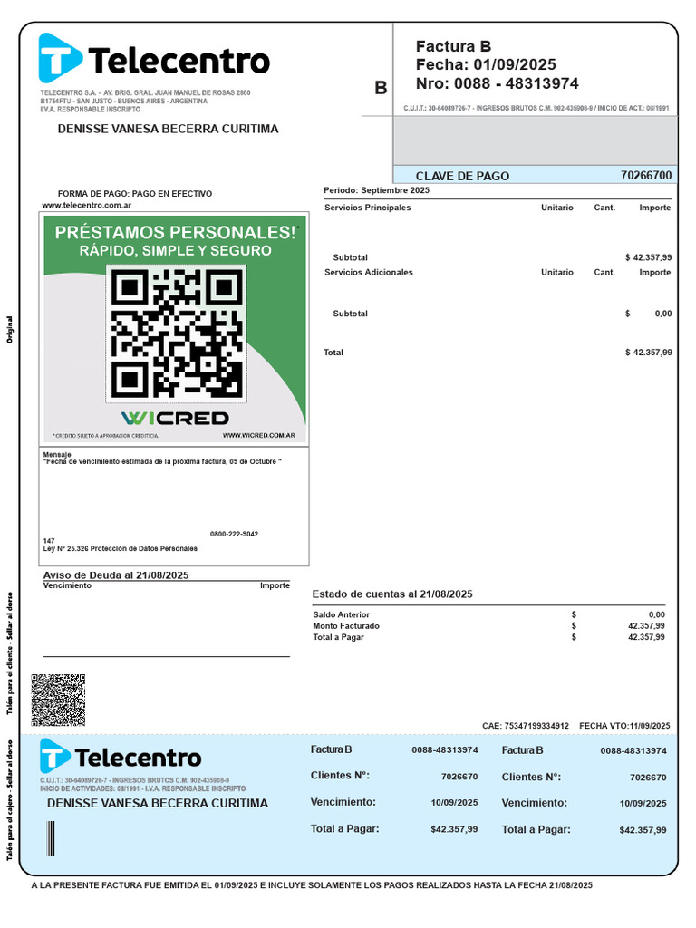 Condición de Venta: Contado TOTAL A PAGAR $42.357,99 CONSUMIDOR FINAL - Documento: 94232115 VENCIMIENTO 10/09/2025 MANUEL OBARRIO 460 P PB D 8 Entrecalles: SALVADOR SOREDA- SARANDI (1872) - GRAN BUENOS AIRES CLAVE DE PAGO 70266700 FORMA DE PAGO: PAGO EN EFECTIVO Periodo: Septiembre 2025 [Link] Servicios Principales Unitario Cant. Importe Televisión $ 19.751,55 1 $ 19.751,55 Telefonía $ 24.075,00 1 $ 24.075,00 Internet 1000 Mb $ 152.119,00 1 $ 152.119,00 50% Off En Abono $ -42.358,00 1 $ -42.358,00 Bonificación Servicio $ -111.229,56 1 $ -111.229,56 Subtotal $ 42.357,99 Servicios Adicionales Unitario Cant. Importe Pack HD $ 23.943,00 1 $ 23.943,00 Promoción Pack HD $ -23.943,00 1 $ -23.943,00 T-Play 09/2025 $ 7.098,00 1 $ 7.098,00 Bonificación T-Play $ -7.098,00 1 $ -7.098,00 Subtotal $ 0,00