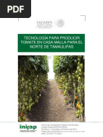 2.5. El cultivo del tomate en la agricultura protegida El sistema de produccin de tomate (Lycopersicon esculentum Mill) bajo condiciones protegidas es relativamente nuevo, generando un impacto importante en los ltimos aos, por su incremento en rea, productividad, rentabilidad y calidad del producto. El rendimiento promedio obtenido con este sistema es entre 5 y 8 kg/planta, superando tres veces el que se obtiene a libre exposicin, que est entre 1,5 y 2 Kg/planta. Este sistema de produccin se caracteriza por la proteccin mediante estructuras levantadas, y cobertura de plstico, con el fin de evitar el impacto de la lluvia sobre el cultivo y su manejo tecnolgico es igual al que tradicionalmente se le hace al cultivo de tomate a libre exposicin (Jaramillo et al., 2006).
