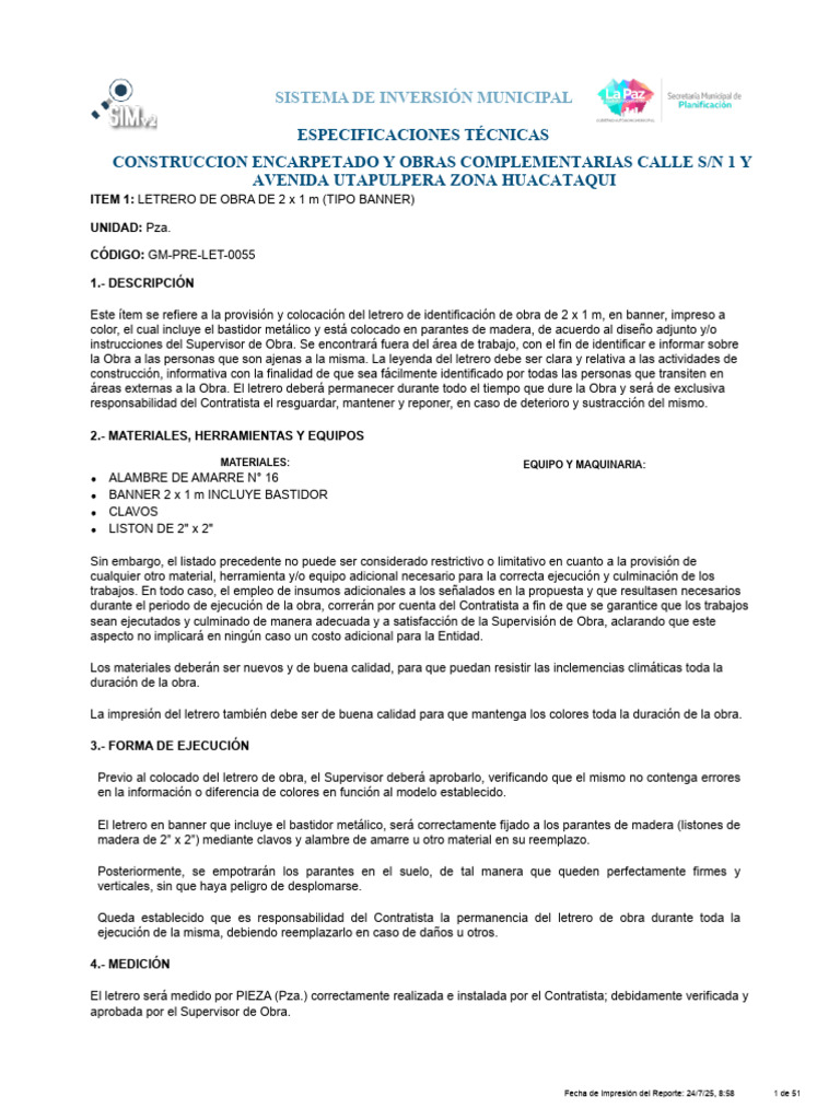 Este ítem se refiere a la provisión y colocación del letrero de identificación de obra de 2 x 1 m, en banner, impreso a