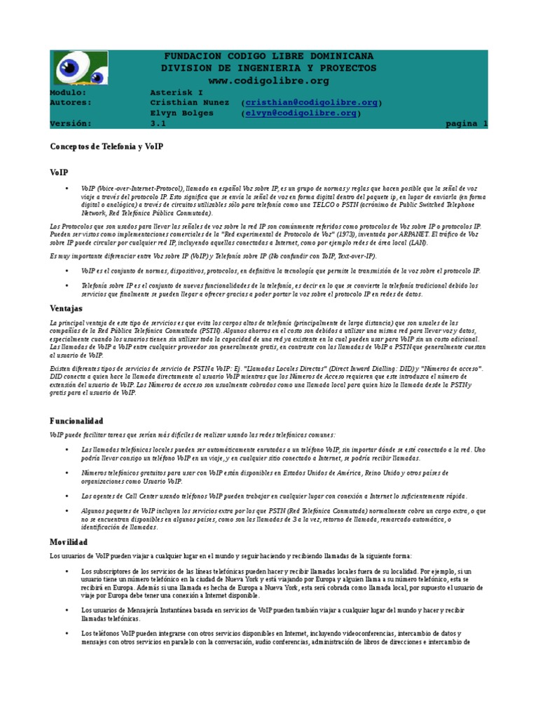 Modulo:AsteriskI Autores:CristhianNunez(cristhian@codigolibre.org) ElvynBolges(elvyn@codigolibre.org) Versin:3.1 Conceptos de Telefonia y VoIP VoIP