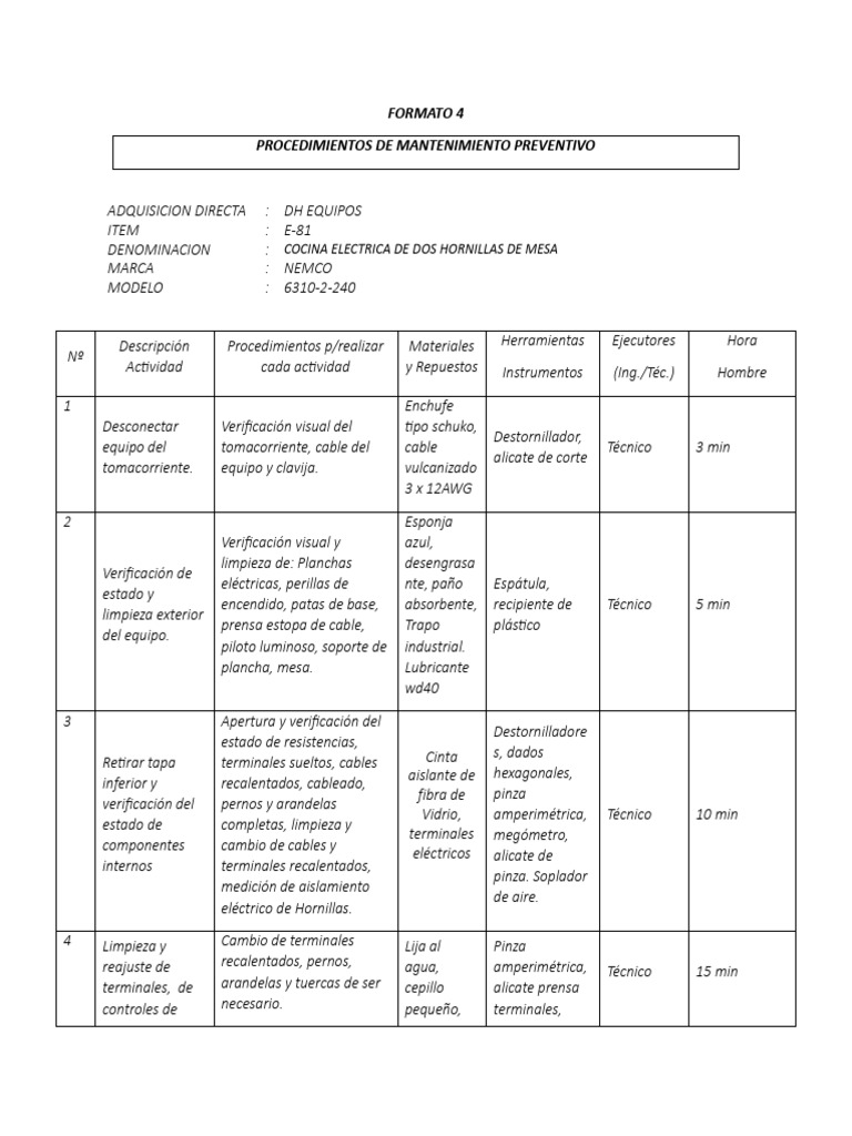 Descripción Procedimientos p/realizar Materiales Herramientas Ejecutores Hora