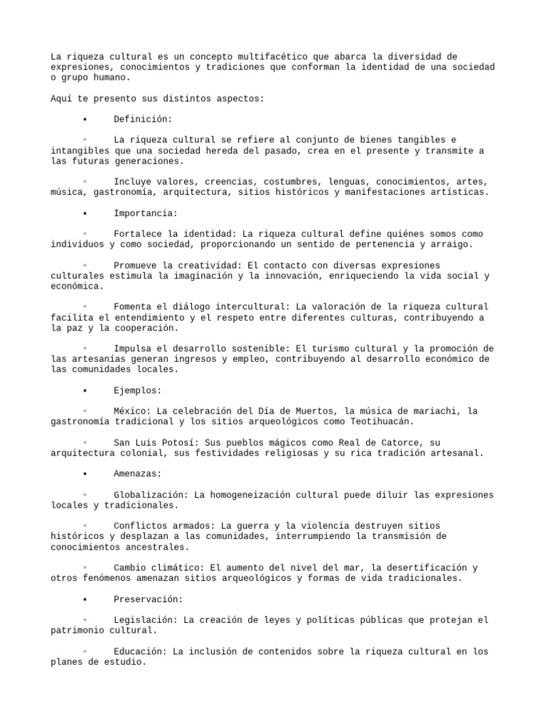¿Te gustaría saber más sobre algún aspecto en particular de la riqueza cultural?