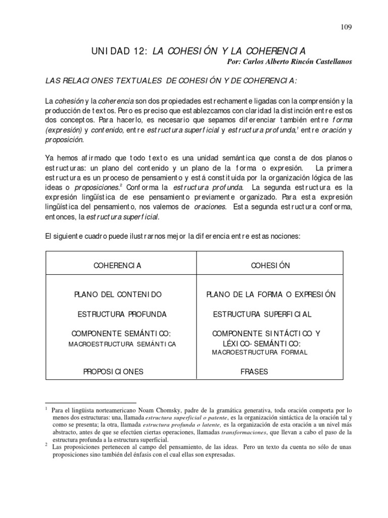 La cohesin y la coherencia son dos propiedades estrechamente ligadas con la comprensin y la produccin de textos. Pero es preciso que establezcamos con claridad la distincin entre estos dos conceptos. Para hacerlo, es necesario que sepamos diferenciar tambin entre forma (expresin) y contenido, entre estructura superficial y estructura profunda,1 entre oracin y proposicin. Ya hemos afirmado que todo texto es una unidad semntica que consta de dos planos o estructuras: un plano del contenido y un plano de la forma o expresin. La primera estructura es un proceso de pensamiento y est constituida por la organizacin lgica de las ideas o proposiciones.2 Conforma la estructura profunda. La segunda estructura es la expresin lingstica de ese pensamiento previamente organizado. Para esta expresin lingstica del pensamiento, nos valemos de oraciones. Esta segunda estructura conforma, entonces, la estructura superficial. El siguiente cuadro puede ilustrarnos mejor la diferencia entre estas nociones: