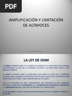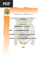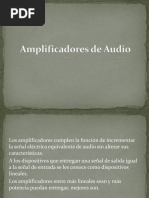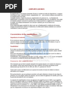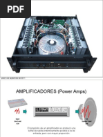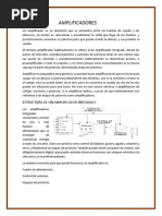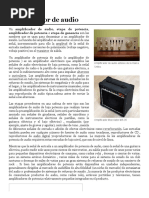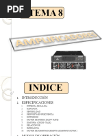 Marco Teorico Etapa de potencia, amplificador de potencia o etapa de ganancia son los diferentes trminos que se usan para denominar a un amplificador de audio. La funcin del amplificador es aumentar el nivel de una seal de entrada mediante corrientes de polarizacin en el transistor de salida. El amplificador trabaja, internamente, con corriente continua; en caso de ser alimentado con la tensin entregada por la red domiciliaria se necesita un transformador y rectificador para adaptar el nivel de voltaje y tipo de corriente a los valores necesarios para el buen funcionamiento del equipo. Cuando se disea un amplificador, es fundamental la refrigeracin del mismo. Por ello, siempre encontraremos rejilla de ventilacin y los fabricantes habrn instalado en su interior ventiladores Esto es porque durante el procesado de amplificacin, en su interior, se disipa gran cantidad calor. Caracteristicas Las caractersticas tcnicas de cada modelo determinarn la calidad del amplificador Impedancia La impedancia es la oposicin que presenta cualquier carga al paso de una corriente, en este caso corriente alterna. Factor de amortiguamiento: Indica la relacin entre la impedancia nominal del altavoz a conectar y la impedancia de salida del amplificador. Potencia de salida: Hace referencia a la potencia elctrica. Como en el altavoz, es la cantidad de energa que se puede introducir en la etapa de potencia antes de que distorsione en exceso o de que pueda sufrir desperfectos. Si el amplificador es estreo, hay que tener en cuenta si esa potencia se refiere a cada uno de los canales o a ambos. Por ello, en las especificaciones tcnicas, se aade una de estas dos indicaciones: con los dos canales alimentados y por canal.