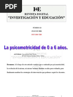Su prensin ser ms fina y precisa, disfruta dibujando, en general los juegos motrices con cubos, encajes, construcciones..., atraern su atencin de la misma manera que todos los movimientos que impliquen la totalidad del cuerpo como subir, bajar, trepar, correr... le proporcionarn gran placer comenzando a ser sta una buena forma de conocer y descubrir el espacio y su entorno. Al finalizar esta etapa comenzar el control de esfnteres. 4.PRIMERA INFANCIA, de 2 a 4 aos: Comienza el control de las posturas tumbado, de pi, sentado y a gatas es apropiado: empieza a conseguir habilidad estando en cuclillas y no pierde el equilibrio durante la marcha. Sube y baja escaleras alternando los dos pies, trepa a sillas y butacas, anda de puntillas y coordina movimientos adecuados para andar en triciclo. Salta con los dos pies y cerca de los tres aos puede hacerlo con uno slo mostrando buen equilibrio. Logra una buena manipulacin, usa tijeras, ensarta en cordeles, utiliza mejor la punta de los dedos, comienza a mostrar predominancia lateral en algunas acciones, aunque algunos no definen su lateralidad hasta los 6-7 aos. La marcha segura y las destrezas que consigue le conceden ms independencia y autonoma, aunque despus de realizarlas buscar de inmediato el apoyo de un adulto, al cual imita en todo momento. Establece ms relaciones sociales con sus padres y es capaz de esperar turno para jugar o realizar cualquier otra actividad de su inters. Al final del tercer ao empieza a conseguir el control de esfnteres durante la noche. 5.SEGUNDA INFANCIA, de 4 a 6 aos: El crecimiento ser casi constante hasta los siete aos, las estructura sea seguir madurando, por lo cual habr que atender de manera importante la nutricin, influir en el crecimiento seo, grosor, forma y nmero de huesos del cuerpo, adems del desarrollo dental. La caracterstica ha resaltar es el aumento de las habilidades en la ejecucin de todas las destrezas psicomotrices. El sentido del equilibrio bien desarrollado le permite sentirse ms confiado de sus posibilidades motrices. Se animar a realizar proezas y acrobacias sin tener en cuenta los peligros; lo cual tiene un lado negativo, pues puede sufrir un pequeo accidente que puede atemorizar tanto a los padres como al nio /a, coartando su actividad. No deberamos permitir que esto sucediera, los accidentes son situaciones fortuitas que a veces, tomando precauciones, podemos evitar. Mas destrezas son: lanzar la pelota con una trayectoria definida, son mucho ms complejas requiriendo equilibrio dinmico y direccionalidad, acciones encadenadas que implican habilidades de las que el nio carece a esta edad. Con algunas actividades el nio disfruta, actividades como moldear, construir, recortar, dibujar, aunque no existe perfeccin en los movimientos de sus manos y a dar trazos que el desea dar. Por lo tanto, nos damos cuenta de lo importante que es el movimiento en s y su evolucin en el desarrollo infantil. Es por eso por lo que la Psicomotricidad debe de estar incluida en el mbito educativo, una educacin que se realiza dentro del marco escolar, trabajando con grupos en un ambiente enriquecido por elementos que le estimulen a desarrollarse gracias a la actividad motriz y al juego.