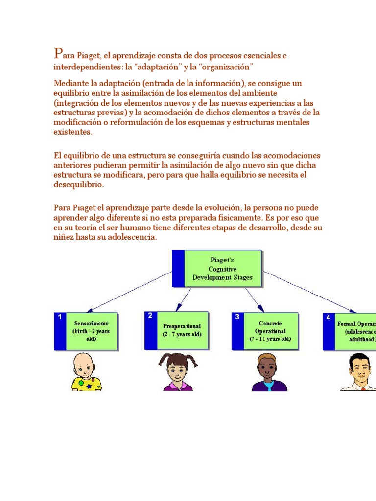 interdependientes: la adaptacin y la organizacin Mediante la adaptacin (entrada de la informacin), se consigue un equilibrio entre la asimilacin de los elementos del ambiente (integracin de los elementos nuevos y de las nuevas experiencias a las estructuras previas) y la acomodacin de dichos elementos a travs de la modificacin o reformulacin de los esquemas y estructuras mentales existentes. El equilibrio de una estructura se conseguira cuando las acomodaciones anteriores pudieran permitir la asimilacin de algo nuevo sin que dicha estructura se modificara, pero para que halla equilibrio se necesita el desequilibrio. Para Piaget el aprendizaje parte desde la evolucin, la persona no puede aprender algo diferente si no esta preparada fsicamente. Es por eso que en su teora el ser humano tiene diferentes etapas de desarrollo, desde su niez hasta su adolescencia.