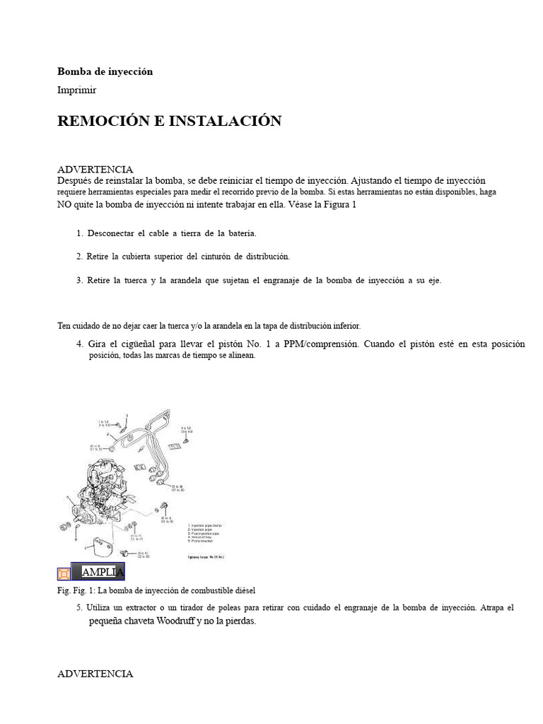 NO quite la bomba de inyección ni intente trabajar en ella. Véase la Figura 1
