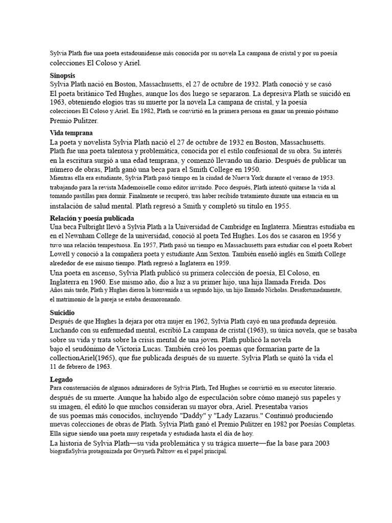 colecciones El Coloso y Ariel. En 1982, Plath se convirtió en la primera persona en ganar un premio póstumo