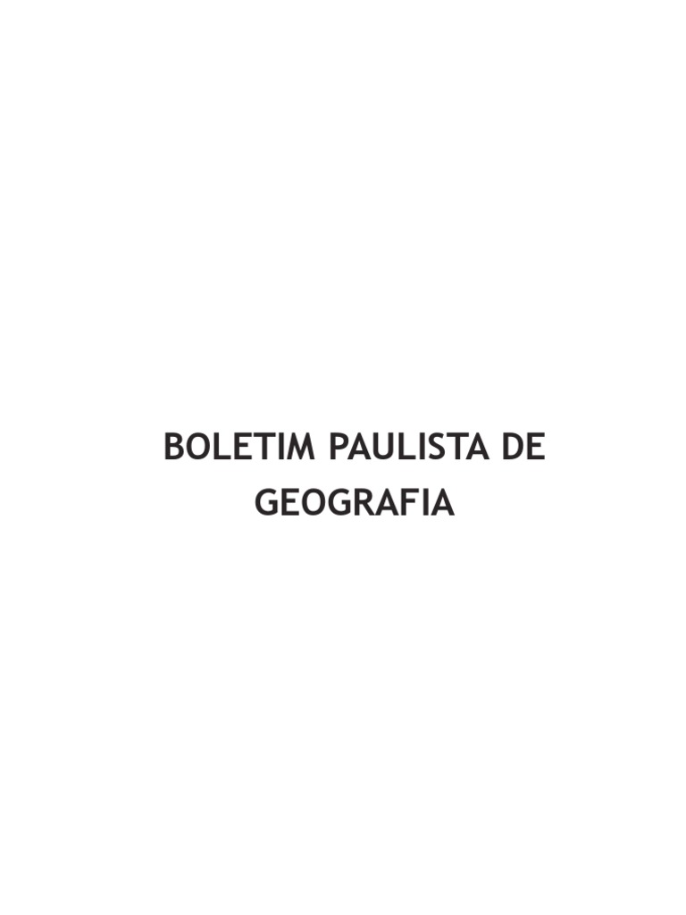 Servio de Biblioteca e Documentao da FFLCH/USP Ficha catalogrfica: Mrcia Elisa Garcia de Grandi CRB 3608 Boletim Paulista de Geografia / Seo So Paulo - Associao dos Gegrafos Brasileiros. - n 1 (1949) - So Paulo: AGB, 1949. Irregular Continuao de: Boletim da Associao dos Gegrafos Brasileiros ISSN 0006-6079 1. Geografia 2. Espao Geogrfico 3. Histria do Pensamento Geogrfico. I. Associao dos Gegrafos Brasileiros. Seo So Paulo. CDD 910