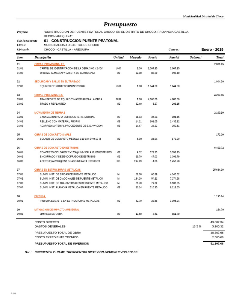 Sub Presupuesto 01 - CONSTRUCCION PUENTE PEATONAL
