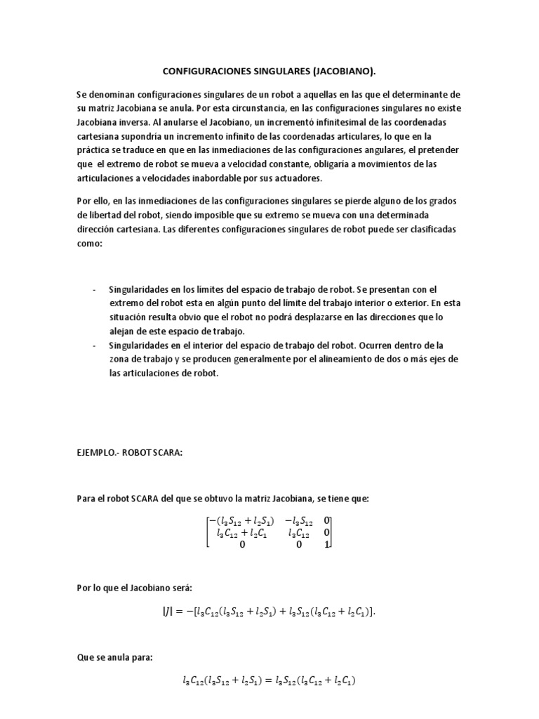 Se denominan configuraciones singulares de un robot a aquellas en las que el determinante de su matriz Jacobiana se anula. Por esta circunstancia, en las configuraciones singulares no existe Jacobiana inversa. Al anularse el Jacobiano, un increment infinitesimal de las coordenadas cartesiana supondra un incremento infinito de las coordenadas articulares, lo que en la prctica se traduce en que en las inmediaciones de las configuraciones angulares, el pretender que el extremo de robot se mueva a velocidad constante, obligara a movimientos de las articulaciones a velocidades inabordable por sus actuadores. Por ello, en las inmediaciones de las configuraciones singulares se pierde alguno de los grados de libertad del robot, siendo imposible que su extremo se mueva con una determinada direccin cartesiana. Las diferentes configuraciones singulares de robot puede ser clasificadas como: