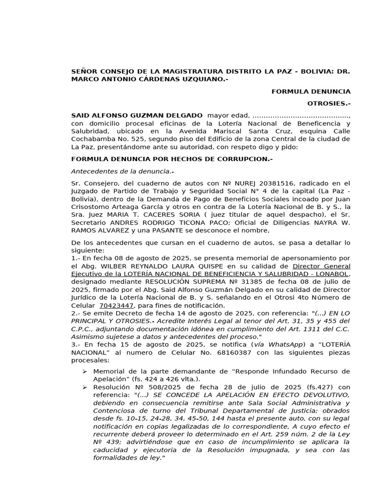 apersonado a WILBER REYNALDO LAURA QUISPE con C.I. Nº 7280987, firmante