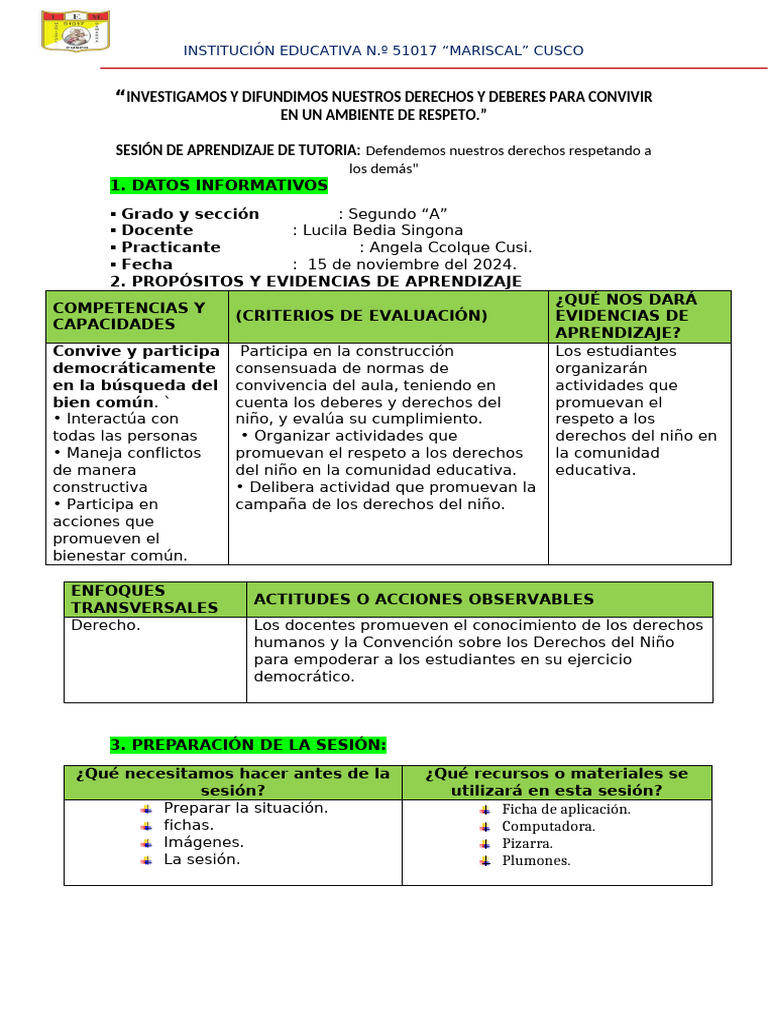 SESIÓN DE APRENDIZAJE DE TUTORIA: Defendemos nuestros derechos respetando a