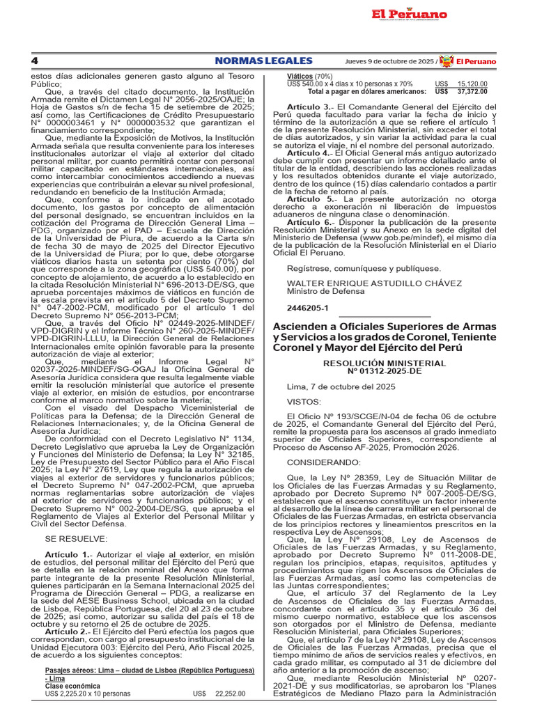 de 2025; así como, autorizar su salida del país el 18 de mismo cuerpo normativo, establece que los ascensos