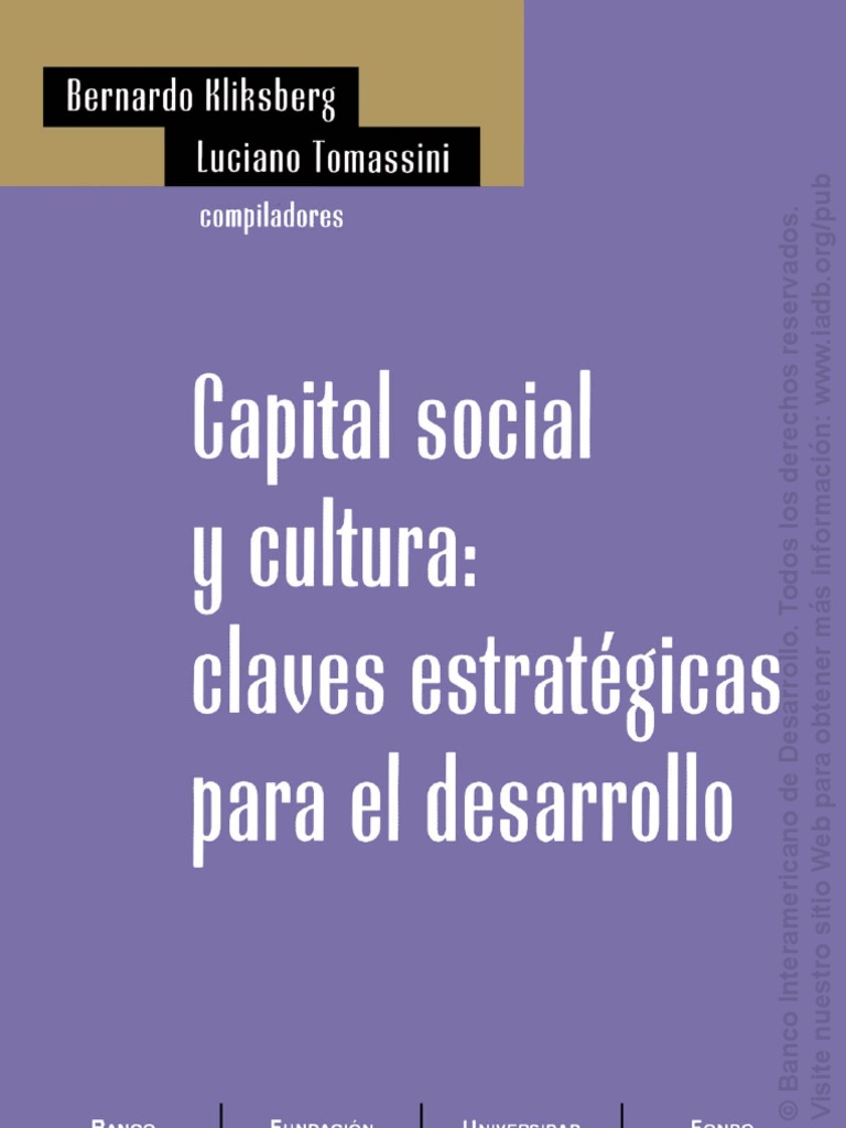 dad y el pluralismo que constituyen hoy una condicin necesaria para ello. Dentro de este proceso las industrias culturales ocupan un papel muy influyente aunque contradictorio, por lo que una parte de este seminario estuvo consagrada al de estos sectores. El Foro consider que la cultura se refiere, Fundamentalmente, a los valores que inspiran la estructura y el comportamiento de una sociedad y de sus distintos miembros, y que ellos inciden en la generacin de aquel conjunto de tradiciones, prcticas e instituciones que conforman el capital social. Tratando de aportar elementos para contestar preguntas como las planteadas antes, ubicado en el encuadre histrico esquematizado, este libro desarrolla varios momentos de anlisis sucesivos. En su primera parte, se enfoca el peso de los valores culturales en los procesos de desarrollo. El tema es abordado desde diversos ngulos: la historia de las ideas, las relaciones entre capital social, cultura y desarrollo, la incidencia del poder, el perfil que ofrecen aspectos bsicos del capital social en algunas de las sociedades latinoamericanas actuales. En la segunda parte, el anlisis se centra sobre una de las mayores exigencias de la poblacin en nuestro tiempo, la participacin, reconocida como gran constructor de capital social. Se examinan el estado del arte en esta materia, la evolucin latinoamericana, el tipo de debate existente, los desafos y escollos que se plantean y las experiencias de la realidad. El tercer fragmento de la obra est dedicado a las polticas culturales aplicadas en la regin. Se realiza una presentacin integral de ellas y se analizan tres casos: Colombia, Mxico y Brasil. Por ltimo, en la cuarta parte, se someten a indagacin las industrias culturales. Se revisan su realidad en la regin y su funcionamiento en el marco de la globalizacion, y se enfatiza en particular la situacin de las editoriales de habla espaola. El lector podr disponer a travs de este trayecto de un cuadro relevante de las discusiones conceptuales sobre el rol del capital social y la cultura en el desarrollo, y contactarse con los dilemas y las alternativas de accin planteados en reas muy concretas ligadas a ese rol, como la participacin, las polticas culturales y las industrias culturales. Todos los trabajos incluidos han sido encomendados a cientficos de extensa y reconocida trayectoria internacional en sus reas. Constituyen, sumados, un equipo interdisciplinario que desde diversas experiencias aporta lneas de reflexin abiertas y provocativas sobre las preguntas antes mencionadas y otras semejantes que pudieran surgir. La obra tiene asimismo, como un rasgo central, su concentracin en los problemas de esta Amrica Latina inmensamente rica en recursos potenciales y, al mismo tiempo, caracterizada por sus altos niveles de pobreza y sus agudas polarizaciones. Tras la mayora de los trabajos subyace la cuestin de cmo aportar desde estas dimensiones de anlisis, capital social y cultura, al diseo de polticas que logren enfrentar estos desafos impostergables. El Foro de Pars surgi de una iniciativa del Presidente del BID, Enrique V. Iglesias, y fue un esfuerzo compartido por varias organizaciones. Participaron en l la Representacin del BID en Pars, que llev adelante una dedicada e intensiv