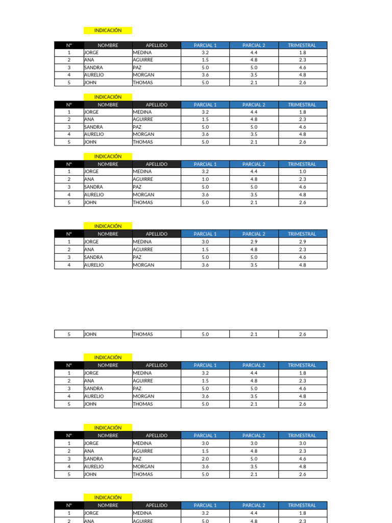 N° NOMBRE APELLIDO PARCIAL 1 PARCIAL 2 TRIMESTRAL