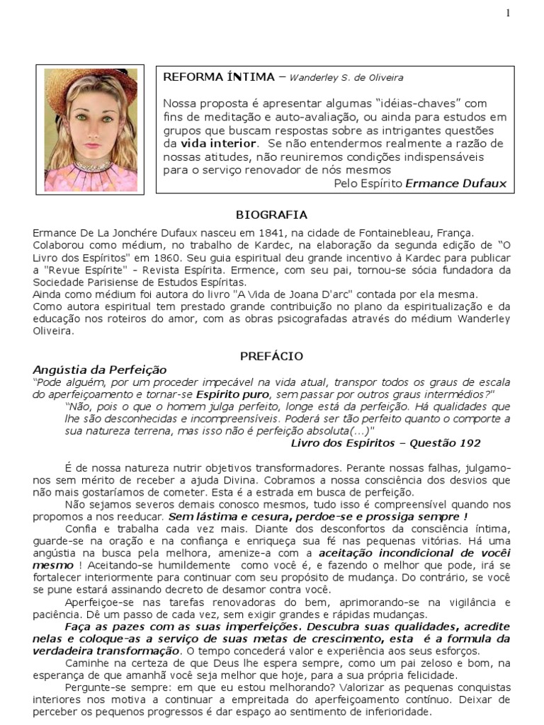 REFORMA NTIMA Wanderley S. de Oliveira Nossa proposta apresentar algumas idias-chaves com fins de meditao e auto-avaliao, ou ainda para estudos em grupos que buscam respostas sobre as intrigantes questes da vida interior. Se no entendermos realmente a razo de nossas atitudes, no reuniremos condies indispensveis para o servio renovador de ns mesmos Pelo Esprito Ermance Dufaux BIOGRAFIA